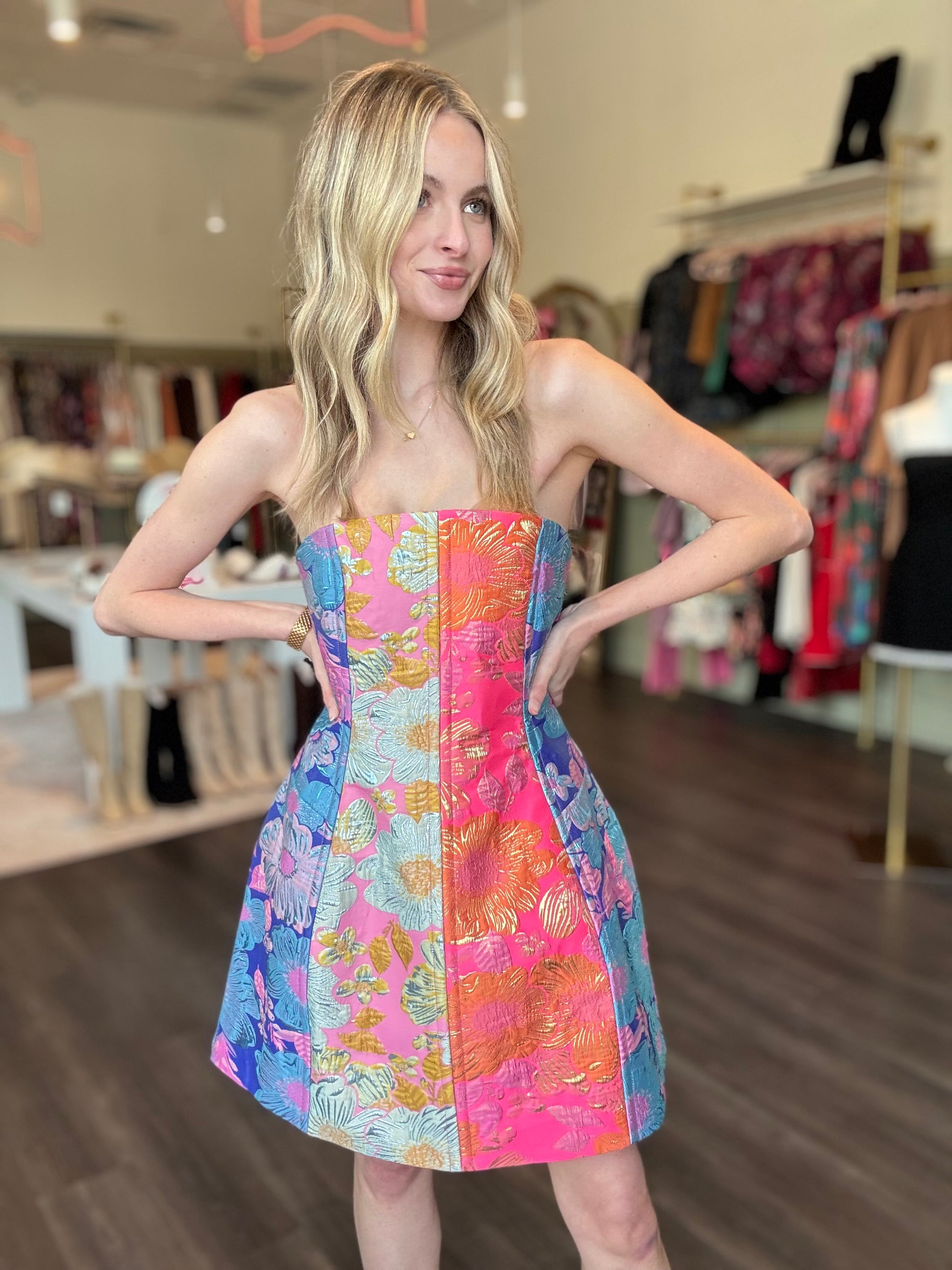 Turn heads in the vibrant Cosmica Mini Dress, a show-stopping strapless silhouette crafted from multicolored metallic jacquard. With its structured bodice, flared skirt, and bold floral patchwork, it’s equal parts playful and polished. Designed for summer parties, weddings, or nights out when you want to shine, the Cosmica Mini Dress is your shortcut to instant glamour.
