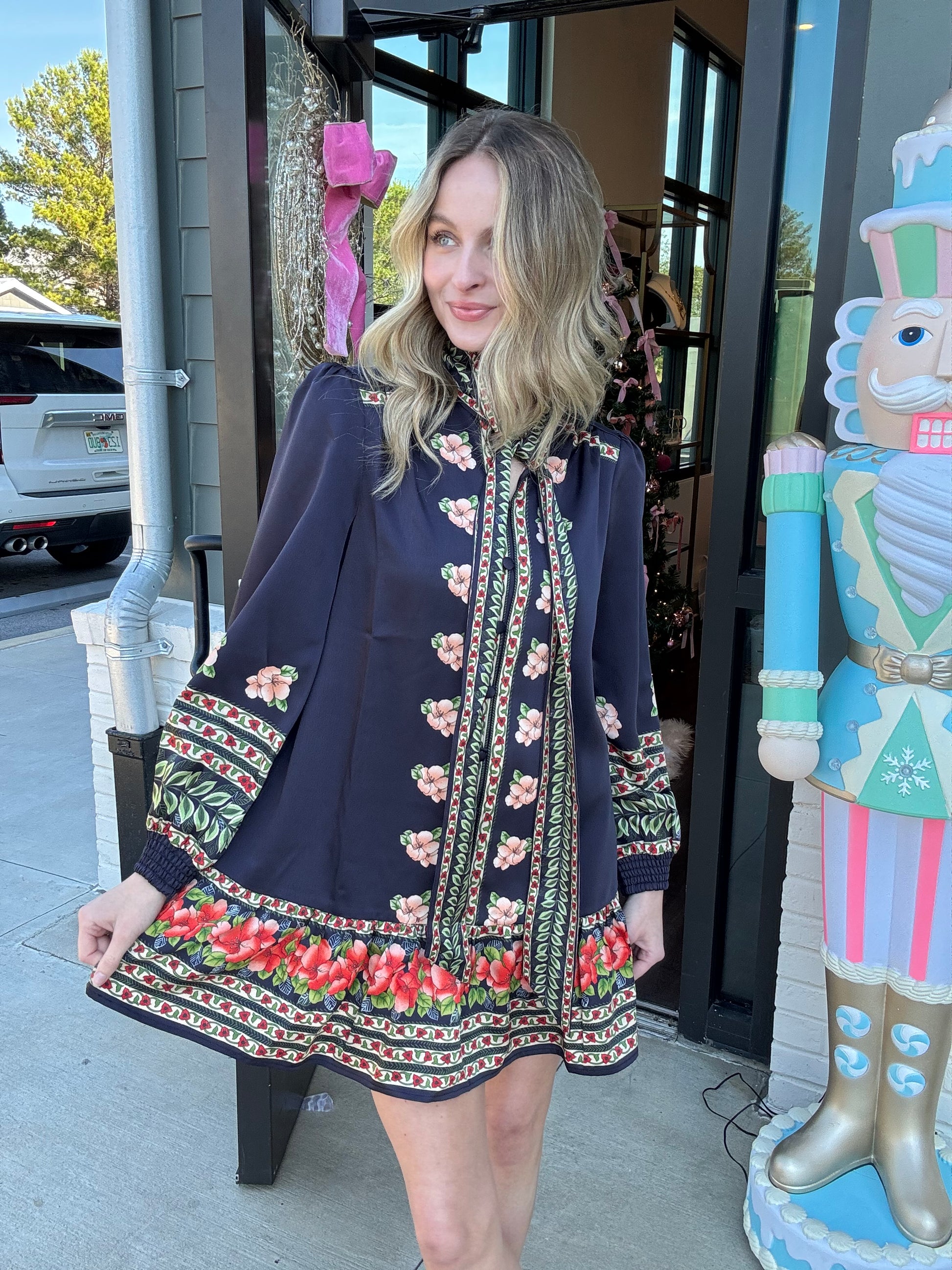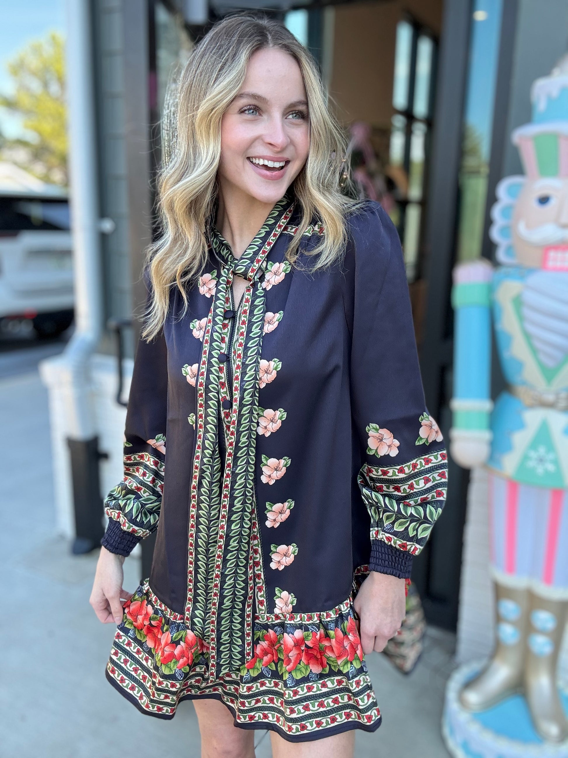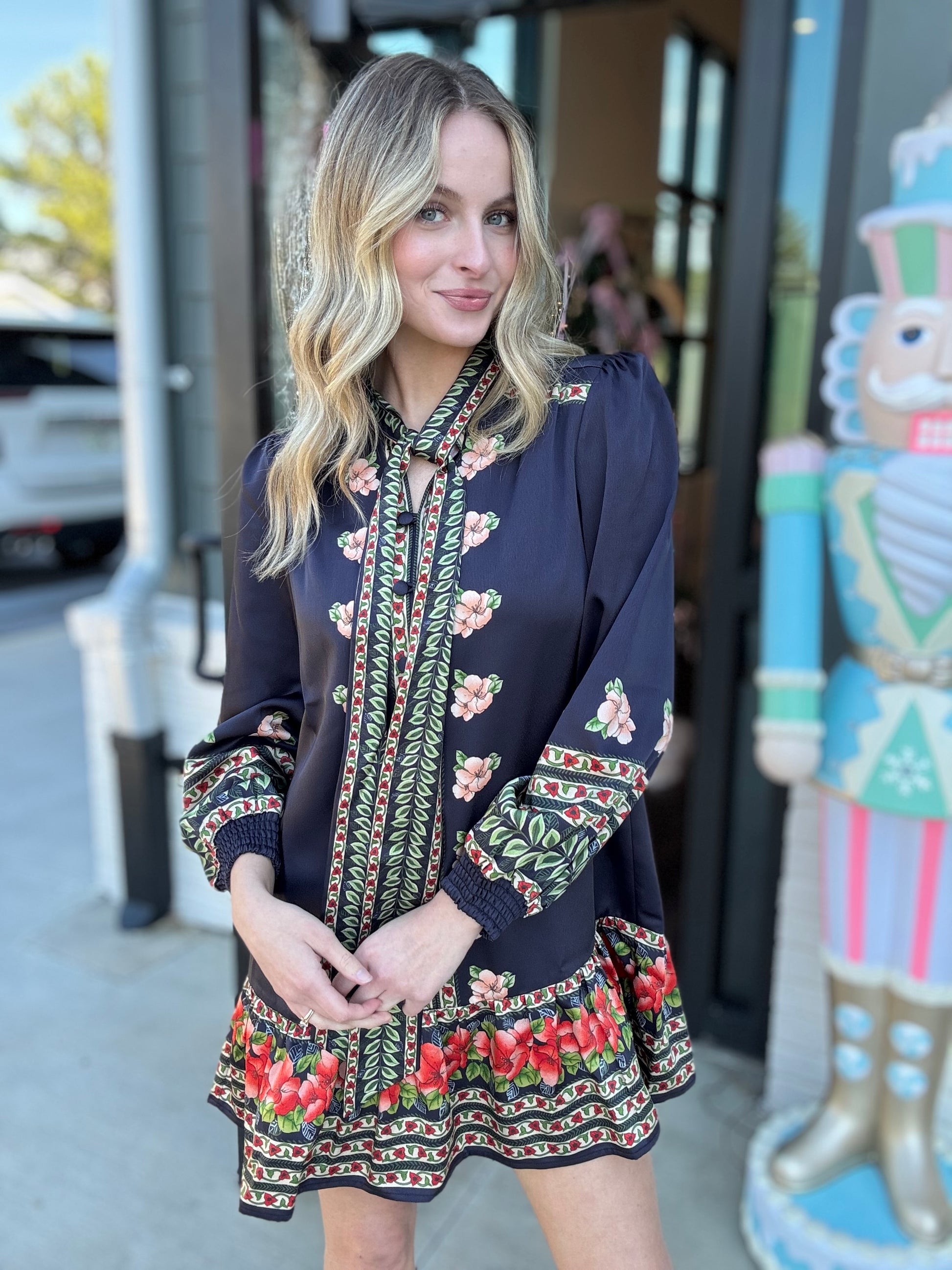 Our darling, feminine Brit Bow blouse just got even better! We added a ruffle hem skirt, turning this vintage 80's inspired silhouette into the cutest Holiday mini dress. Pair with some black tights and heels for an easy, chic look.