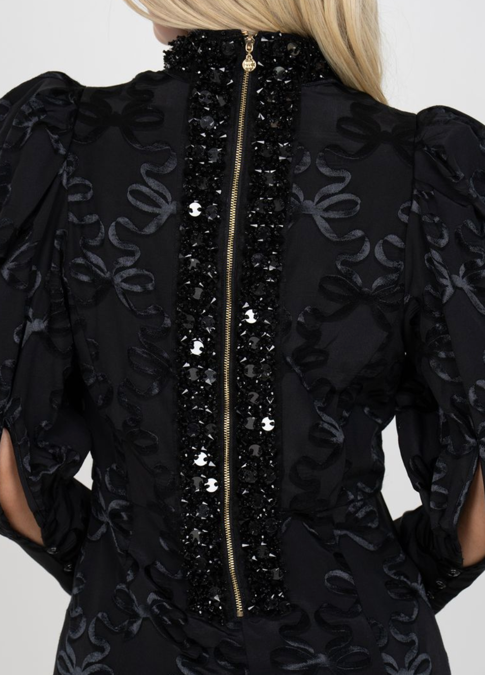 The perfect holiday dress from Emily Mccarthy. She is STUNNING! The bow + jewel detail is fun, classic, and will definitely be the talk of the party. Be the best dressed at your next holiday event1