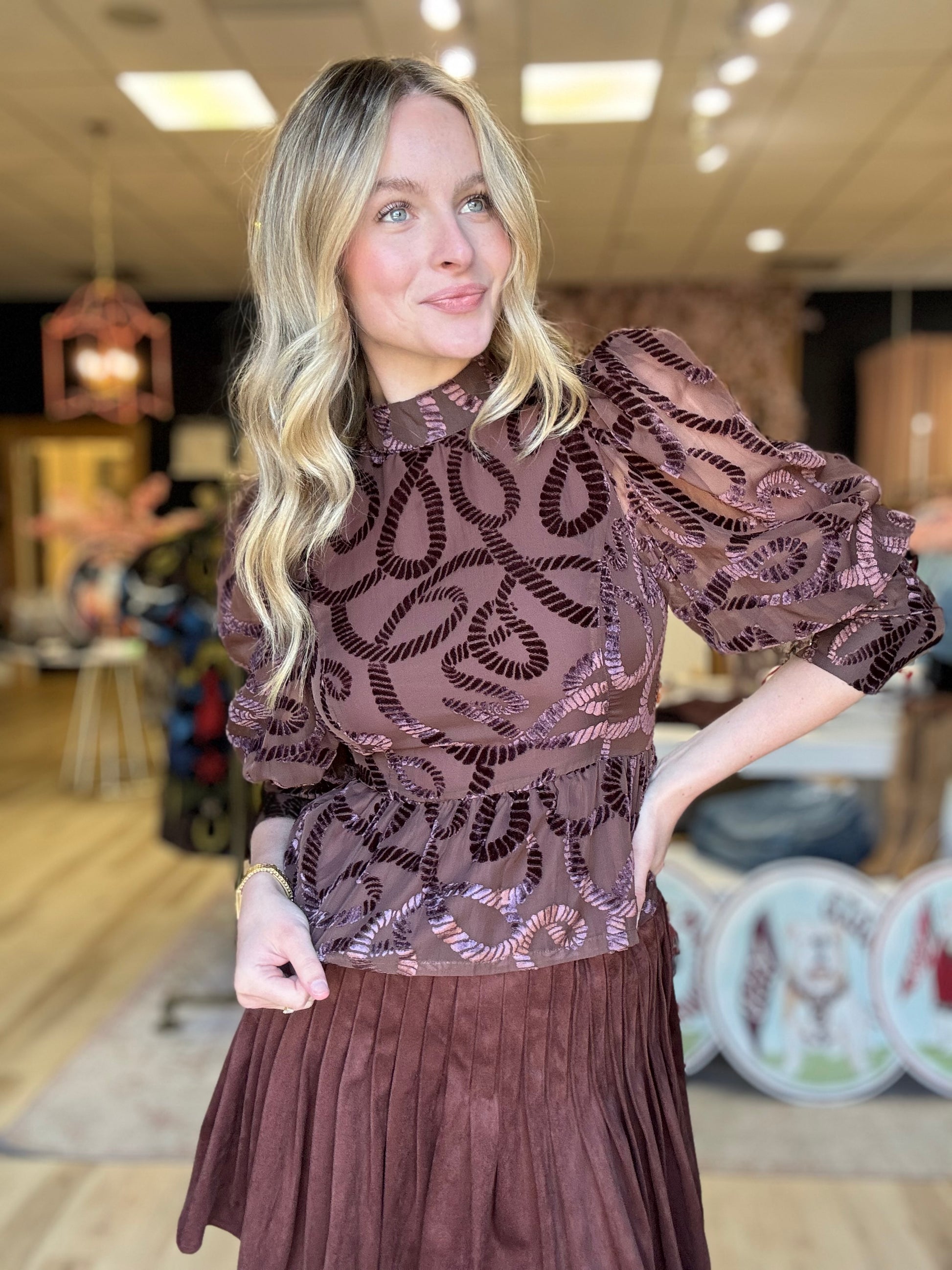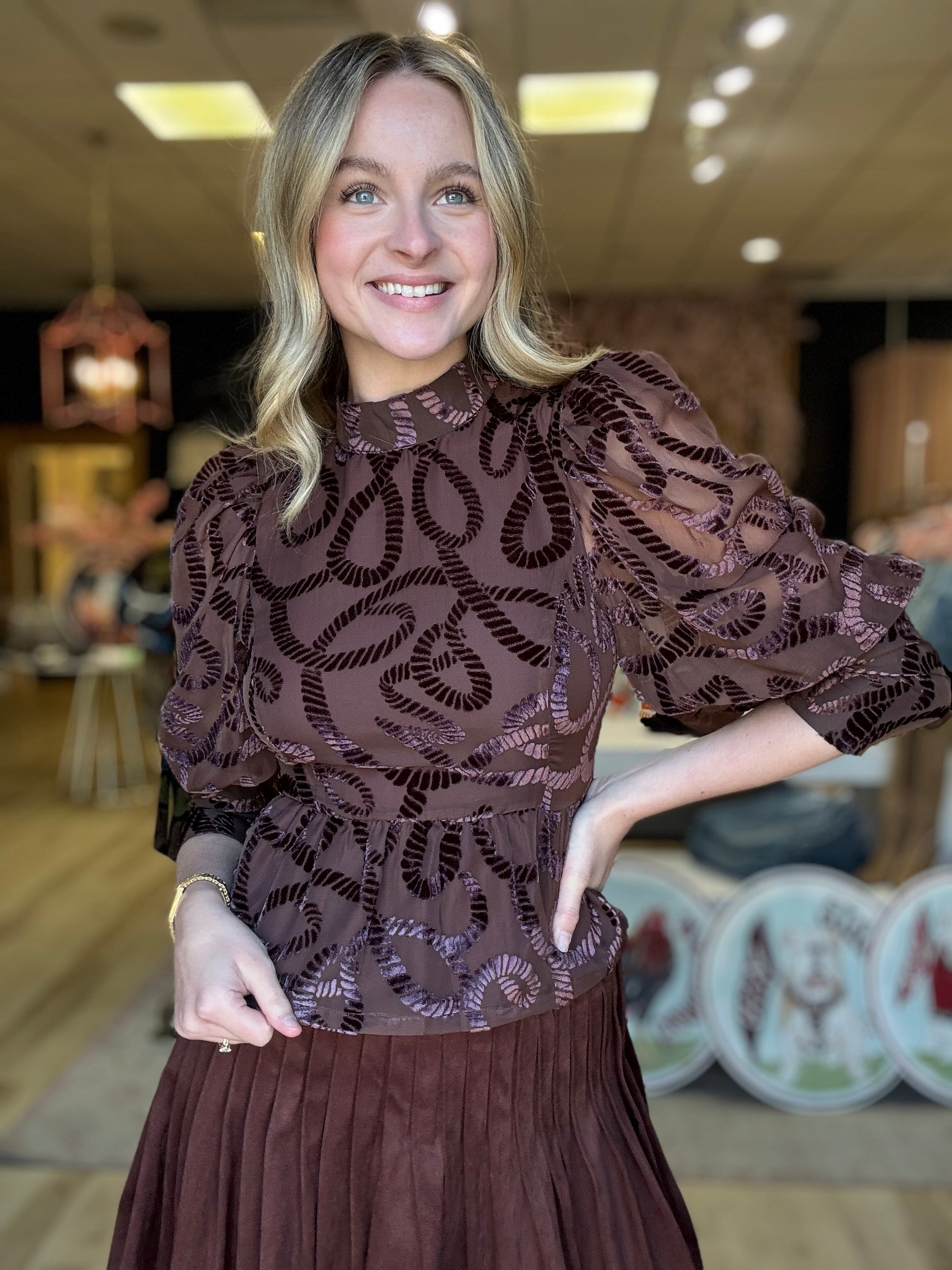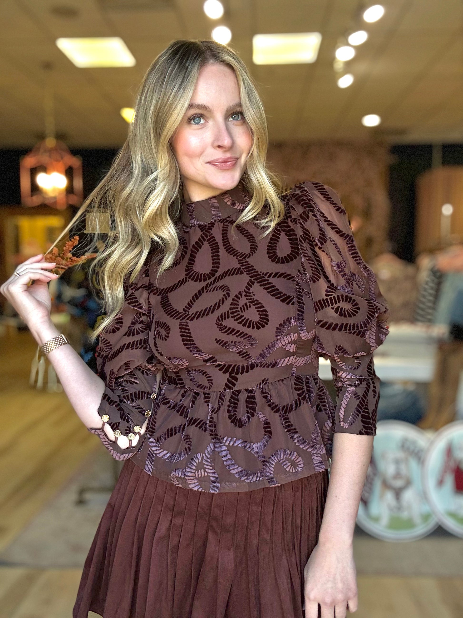 The Zoe Top in Rope is a striking blend of texture and silhouette, designed with voluminous puffed sleeves that taper into a slim fit for a dramatic yet wearable shape. A mock neckline, peplum hem, and back zip closure add polish to the feminine cut. The velvet rope motif spells out “JOY” across the fabric, a subtle nod to western-inspired detail that remains chic, unique, and elevated. Perfect for statement dressing, this top balances playful texture with timeless sophistication.