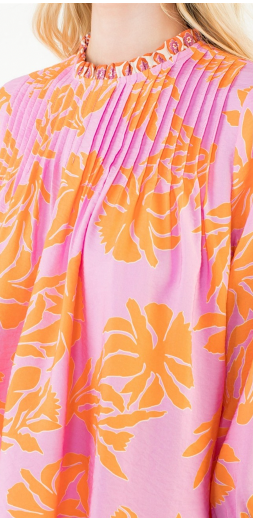 The prettiest colorful floral print top from our favorite THML! We love the high neck, ruffle detail, pleated front, and fit! Pair with your favorite shorts, or white denim. Runs TTS.