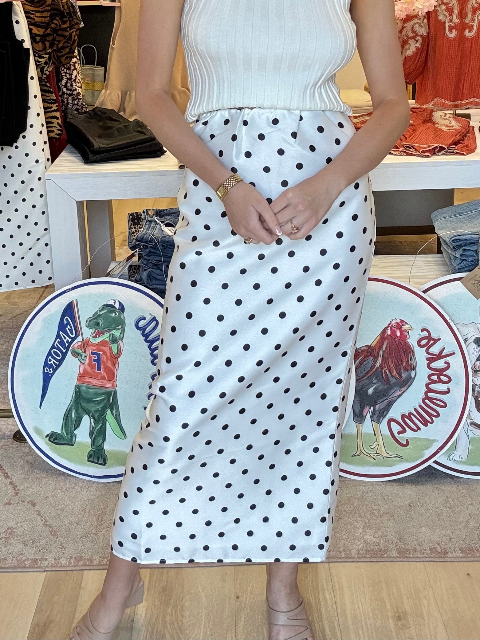 A gorgeous new arrival from our favorite FC! We LOVE polka dots this fall, and they are everywhere! This gorgeous skirt is perfect for fall transition. Pair with a black tee/sweater for easy everyday wear! Add a strappy sandal, or a boot! We LOVE