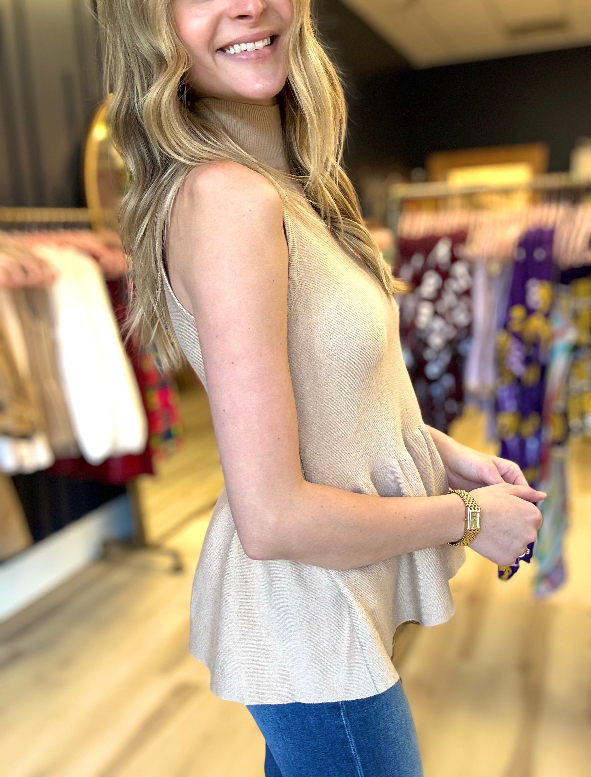 A best seller is back in the most gorgeous neutral. The perfect sweater top for warm falls. We adore the mock neck, soft/luxurious material, beautiful peplum, and fit. The prettiest top for easy everyday wear.