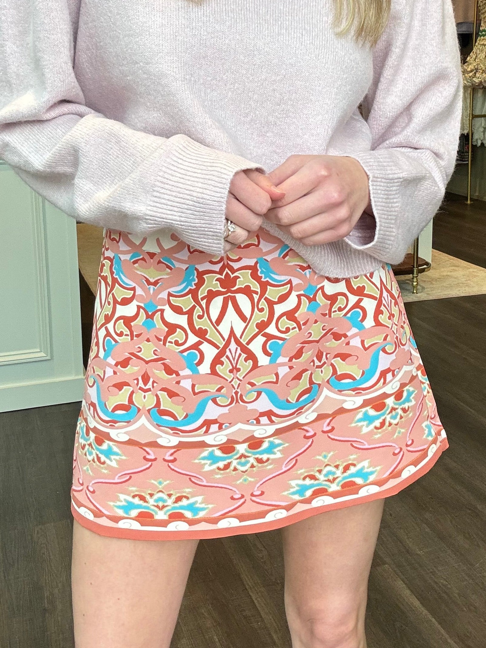An abstract printed skort for spring.. say less. We adore this skort. Zipper closure, fun print, easy to dress up or down, and the best fit. Two amazing colors