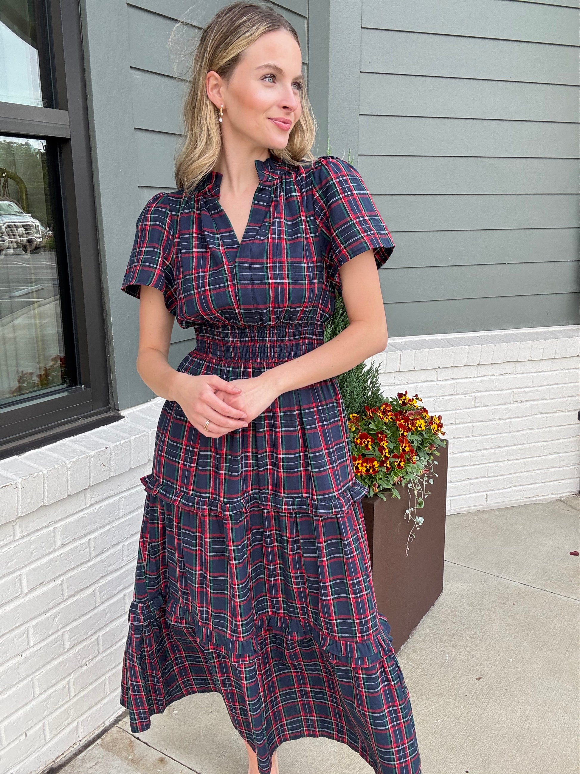 Enjoy the looks the Miley Plaid Palmer Poplin Tiered Maxi Dress is giving! The most loved plamer poplin dress is back and now in a plaid style. Lightweight poplin maxi that features a split neckline and billowing short sleeves. The smocked waist tops ruffle tiered layers to a lengthy skirt. It's a cute dress to pair up with boots!