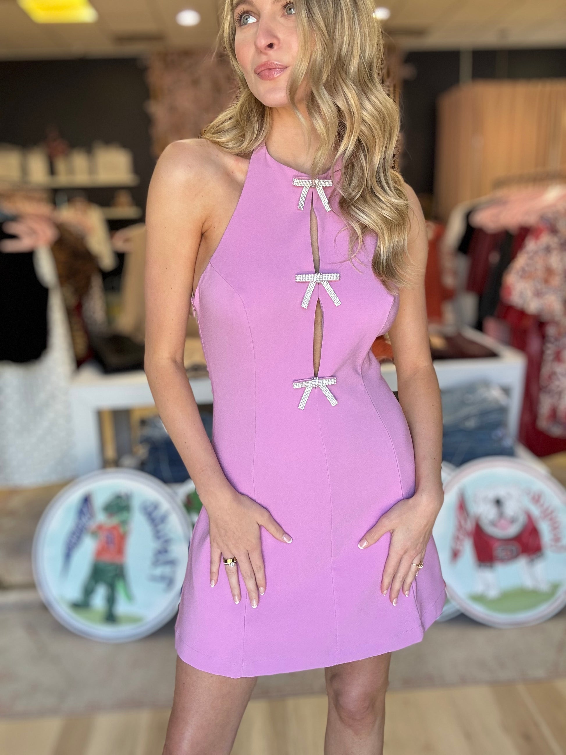 Fall + Holiday event ready in the cutest bow mini! We adore this gorgeous dress. Featuring a high neck, delicate jeweled bow detailing, adjustable neck (3 snaps to adjust by), and the CUTEST fit and flare look. Pair with your favorite sparkly heel and you are set!