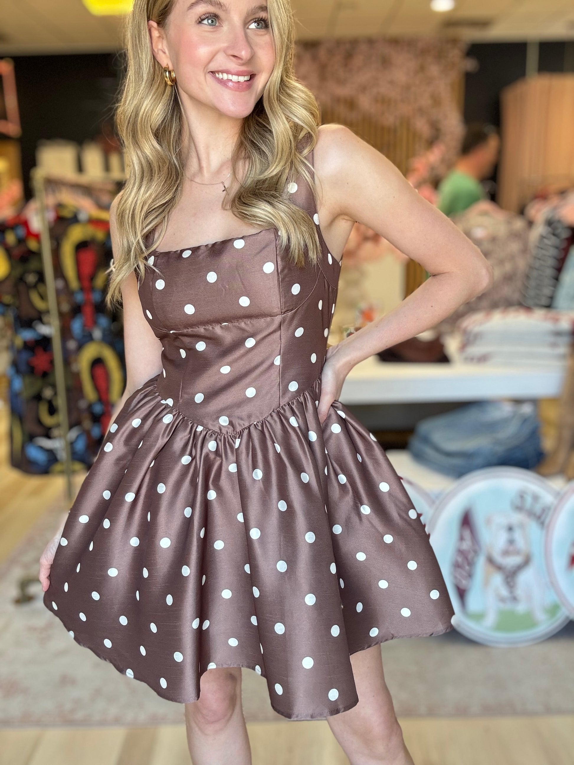 The cutest new mini for a fall wedding! We adore the espresso color, polka dot print, square neckline, and fun skirt! Pair with your favorite heels for an effortless event look!