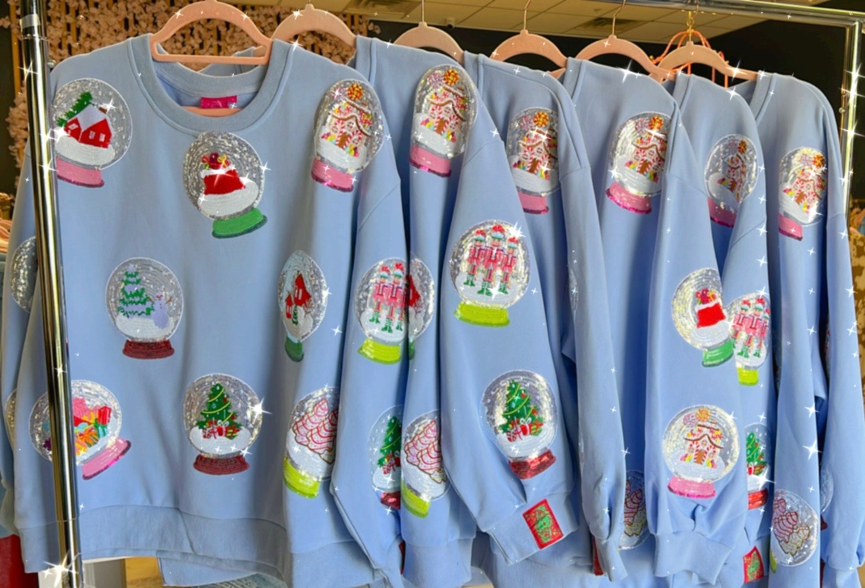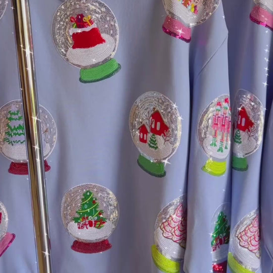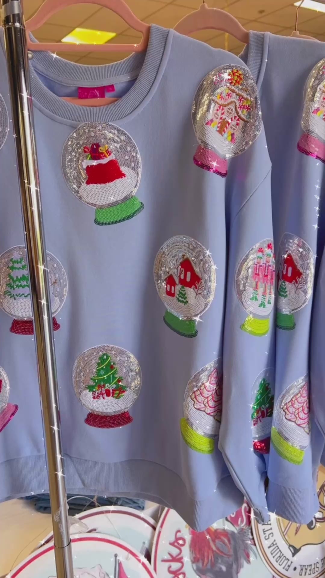 Yay! First of Queen Christmas is here and she is so cute! Front and back sparkly globes! Each globe has a different sequin Christmas design! Perfect for a casual Christmas, and we are OBSESSED!